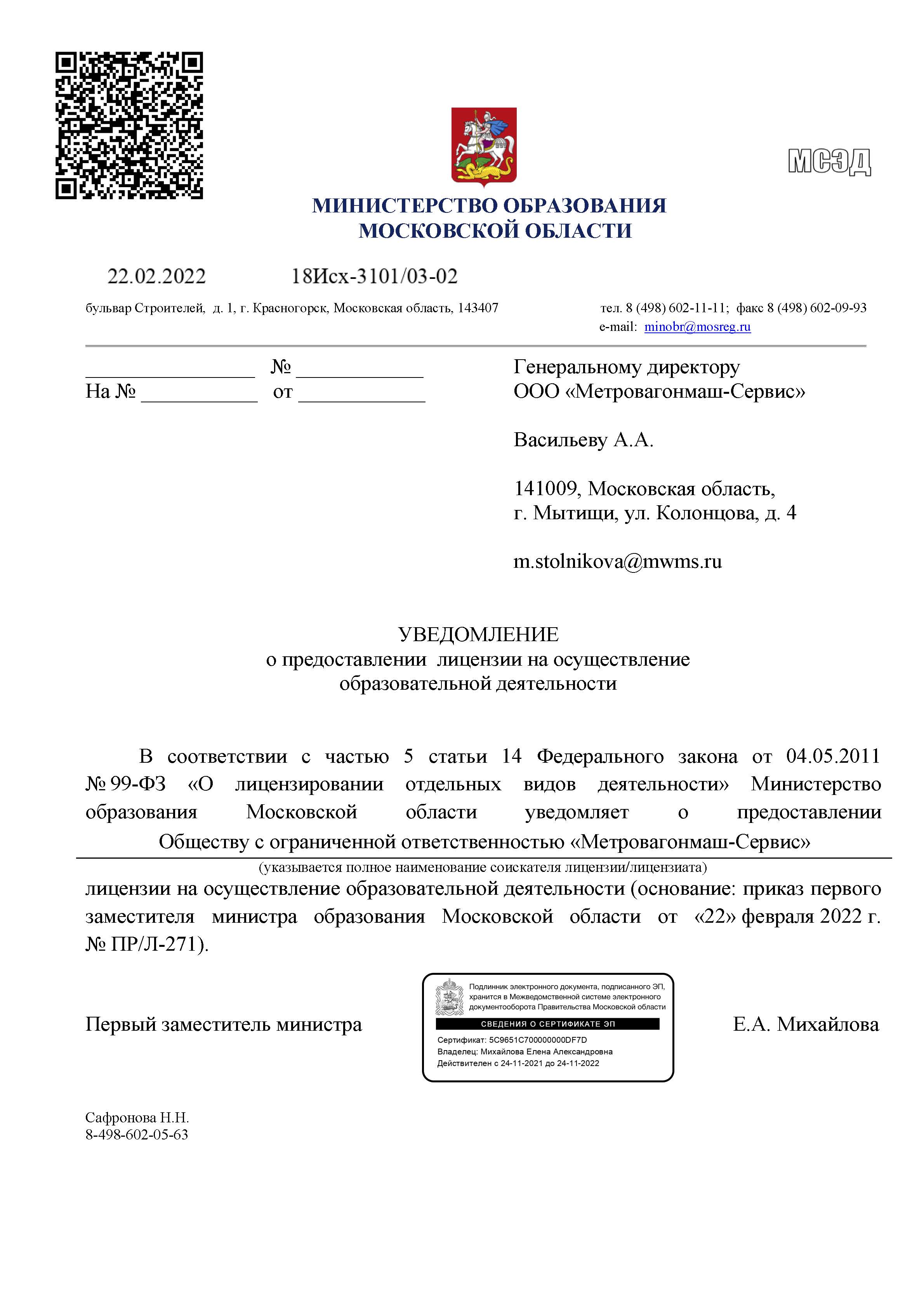 Лицензия на право осуществления образовательной деятельности №78778 от 22.02.2022, выдана Министерством образования